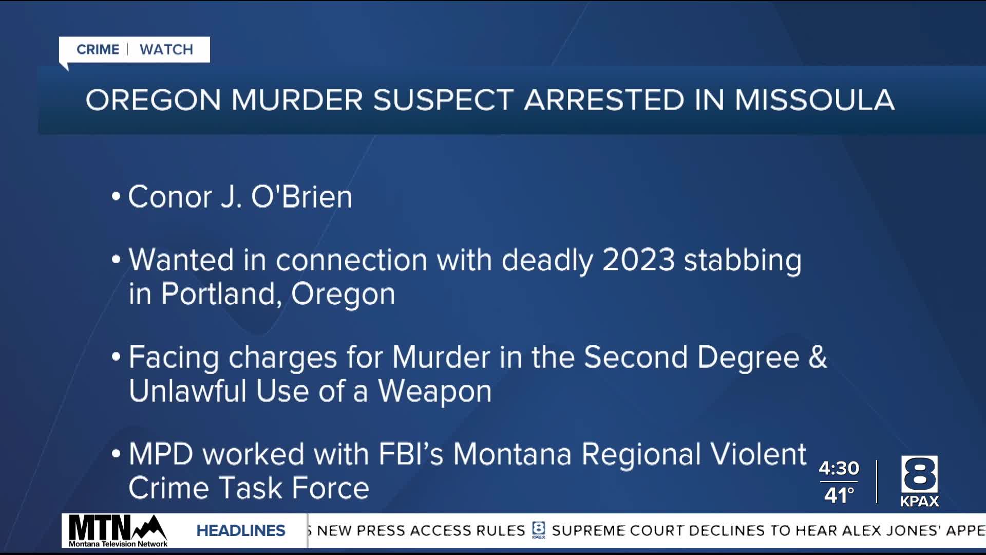 The Missoula Police Department and the FBI’s Montana Regional Violent Crimes Task Force arrested 21-year-old Connor J. O’Brien on Monday.