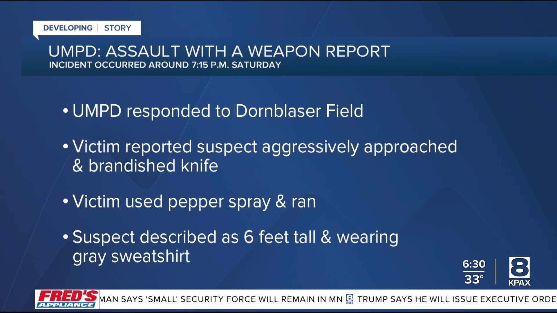 The University of Montana Police Department reports officers responded at 7:15 p.m. to a report of an assault with a weapon on the trail between the soccer and softball fields near the intersection of Higgins and South avenues.