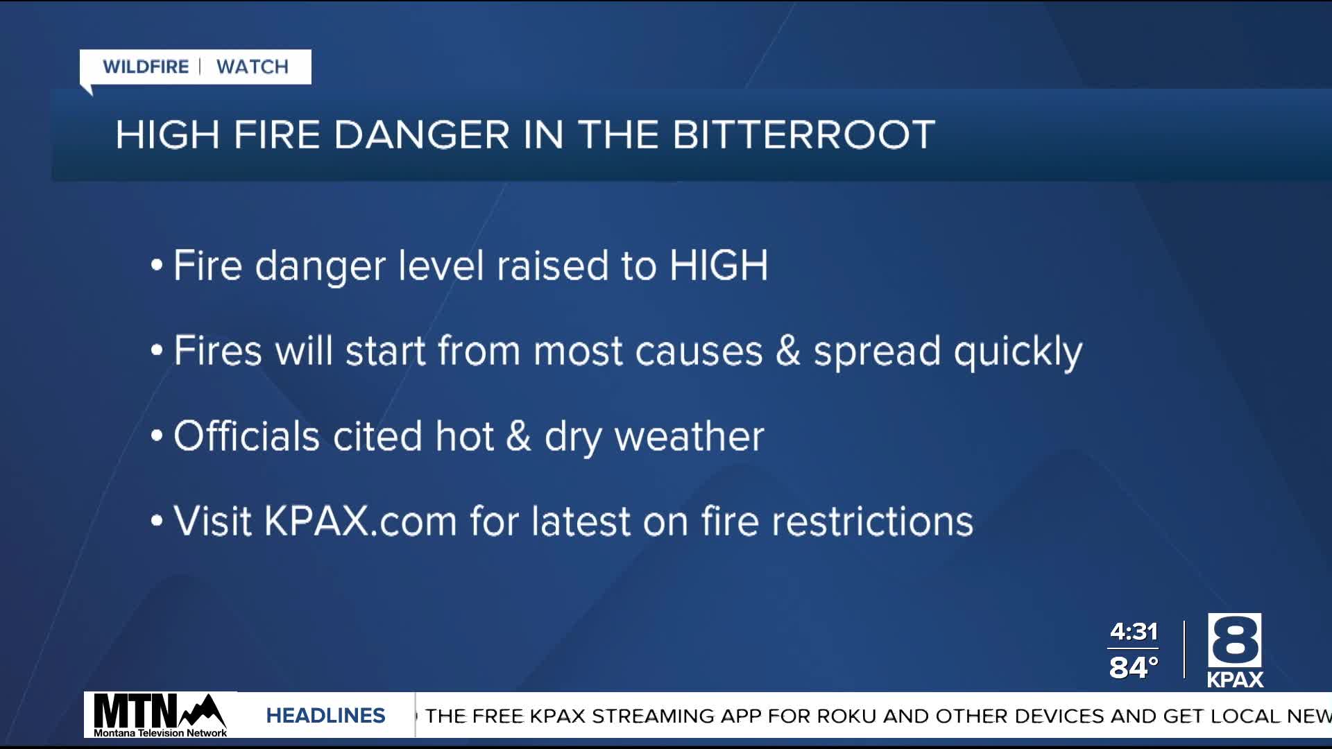 HAMILTON — The fire danger level has been hiked to "high" on the Bitterroot Danger as of Wednesday because of continued hot and dry weather.