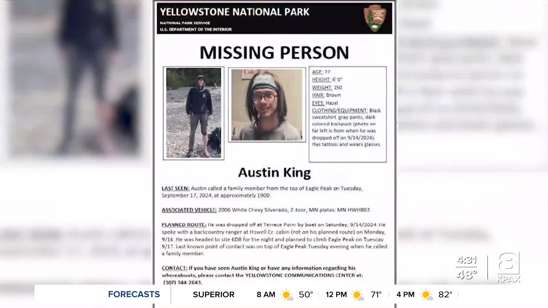 - King, a concession employee working in Yellowstone, was reported overdue to the Yellowstone Interagency Communications Center when he failed to arrive for his boat pickup near Yellowstone Lake’s Southeast Arm on Friday afternoon, Sept. 20, after his planned 7-day backcountry trip to summit Eagle Peak.