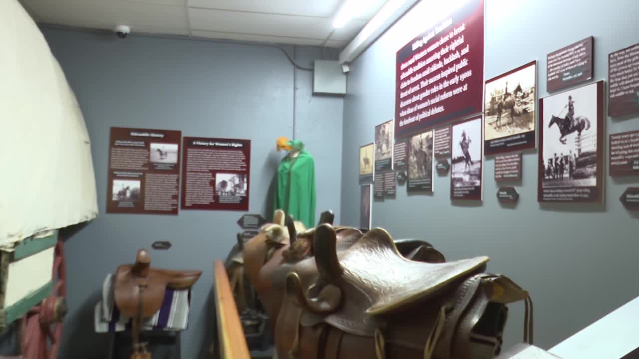 A Western saloon with a historic bar mirror and Calamity Jane's playing cards and poker chips, and, an exhibit showing the social movement against side-saddles and how women fought for equal rights in horseback riding.